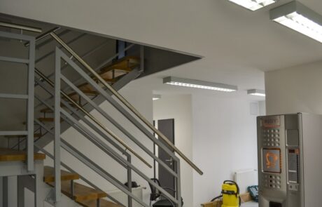 Projektovali smo i proizveli unutrašnje stepenište koje povezuju prizemlje i prvi sprat montažnog objekta. Gazišta unutrašnjih stepenica izvedena su od kvalitetnog tvrdog drveta sa rukohvatima od nerđajučeg čelika ( inox AISI 304 ) dok su gazišta spoljašnjih stepenica proizvedena od protivkliznog vruće cinkovanog čelika.