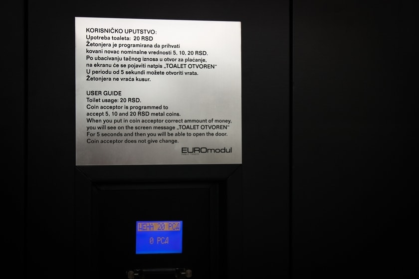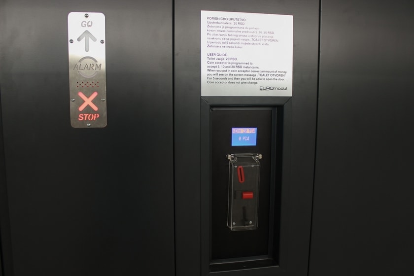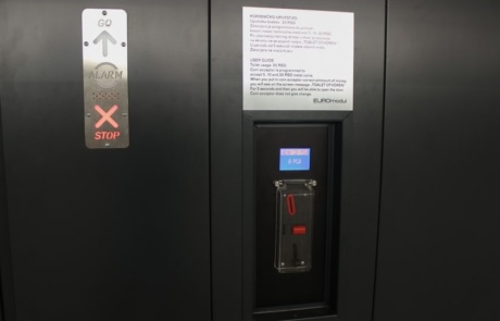 Naplata ulaza vrši se putem kovanica bez povratka novca ( bez kusura). Montiran je unapređeni sistem (elektronika i software) rada, nadzora, kontrole sistema, kontrole pristupa, automatske dojave usled zastoja u radu ili nedostatka tehničke vode, odnosno najave kritičnog nivoa tanka za fekalije. Sistemu za nadzor pristupa se web browser-om sa bilo koje lokacije putem interneta.