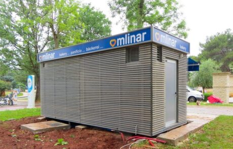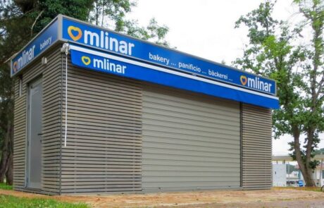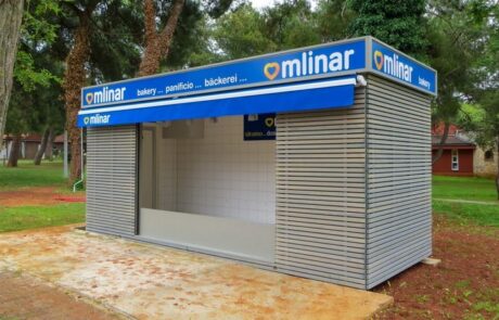 Euromodul ist der größte Hersteller von Kiosken in Südosteuropa mit Erfahrung in der Entwicklung und Herstellung von langen 27 Jahre und Zehntausende von verschiedenen vorgefertigten Gebäuden hergestellt. Für die Zwecke von Mlinar, änderten wir den Standard-Design-Kioske Modell 3400 gemäß den gewünschten Spezifikationen und produziert es für den Verkauf von Backwaren . Wärmedämmung von Wänden, Böden und das Dach ist aus Polyurethan-Platten hergestellt doch endgültige Fassade besteht aus imprägniertem Holzlatten, die in RAL grau lackiert.
