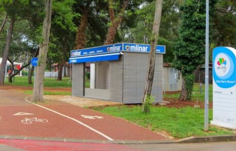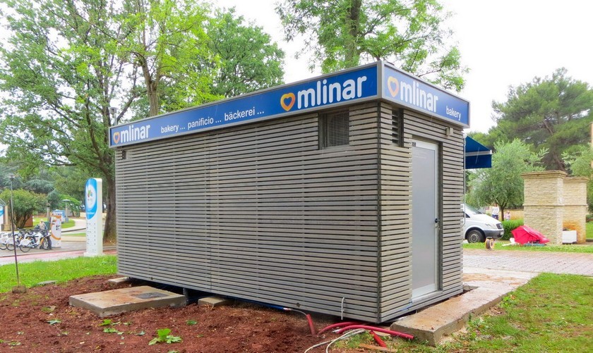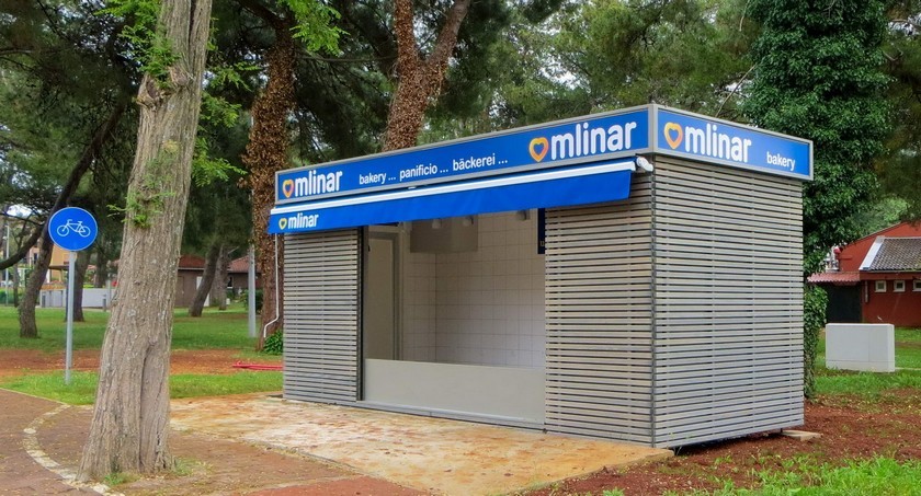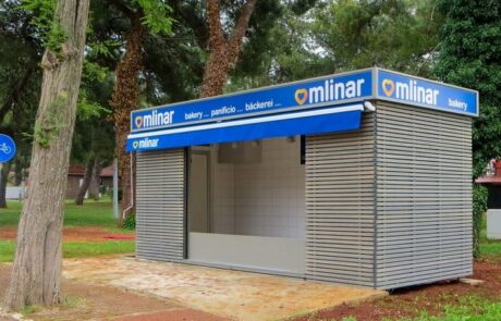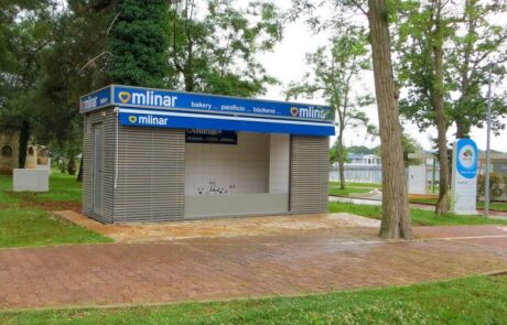 Für die Zwecke des Verkaufs von Bäckereiprodukte die größte kroatische Hersteller MLINAR haben wir entworfen und mehr Stücke von maßgeschneiderten Kiosken Typ 3400 Dimension 6m x 2,5m produziert nach individuellen Spezifikation. Das einfache Design und Fassade aus Holzbrettern, sind Kioske eine natürliche Passform am Standort im grünen Gürtel nahe am Meer.
