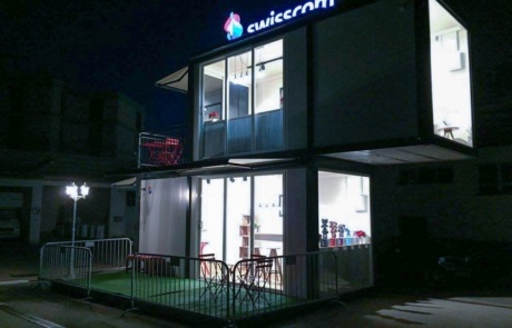 Kancelarijski kontejnerski sklop proizveden po meri za SwissCom iz EUROmodul EUROSTANDARD kontejnera koji se postavlja u dve različite varijante za evente i prezentacije. Sklop se sastoji od 2 kontejnera dimenzija 6,0 x 2,4 vanjske visine 2,8m. Svaki kontejner poseduje i dva zasebna ulaza, koji se koriste u zavisnosti od varijante slaganja objekata.
