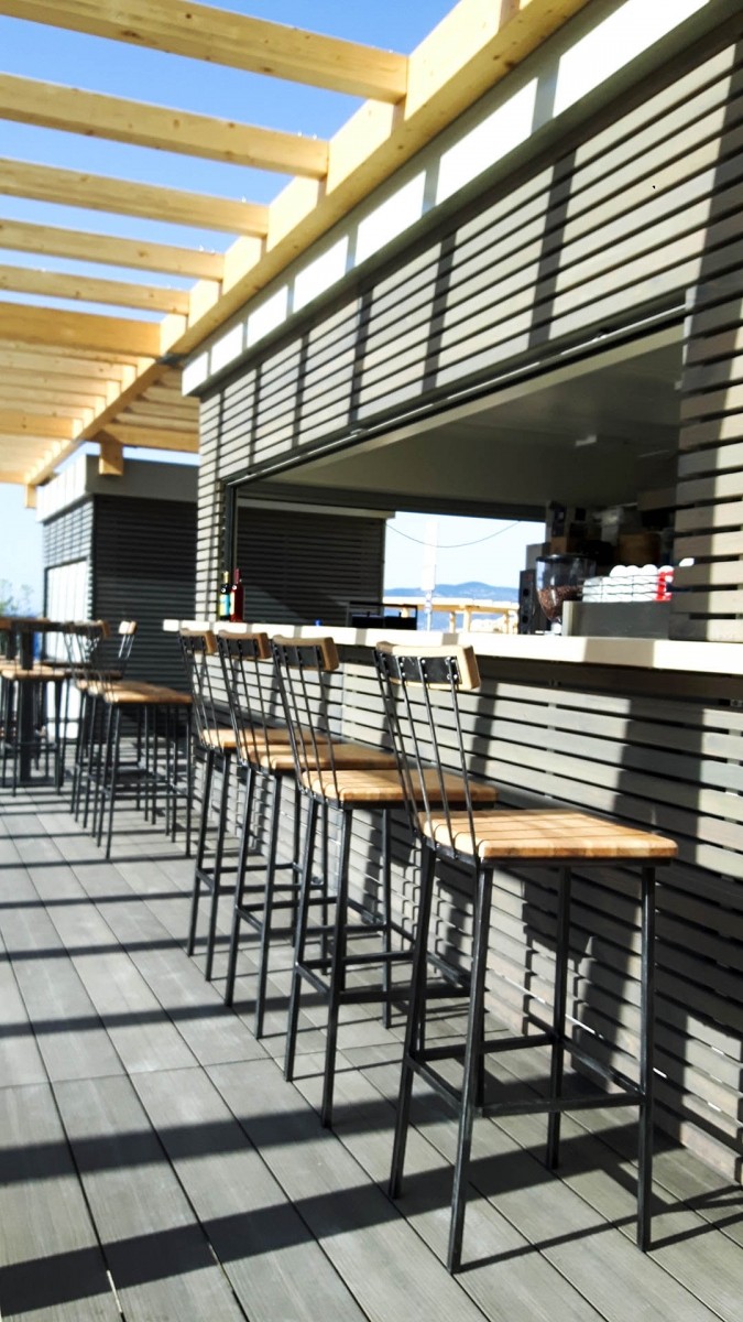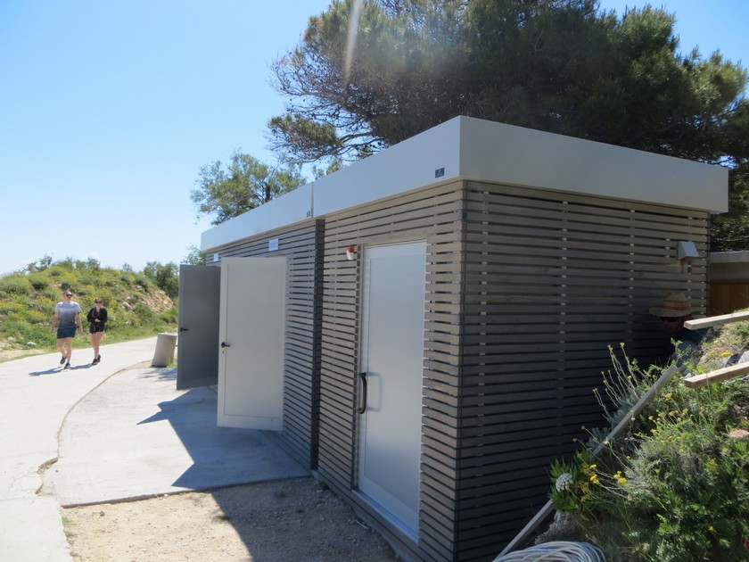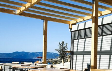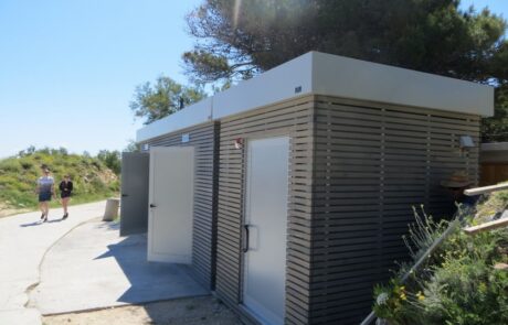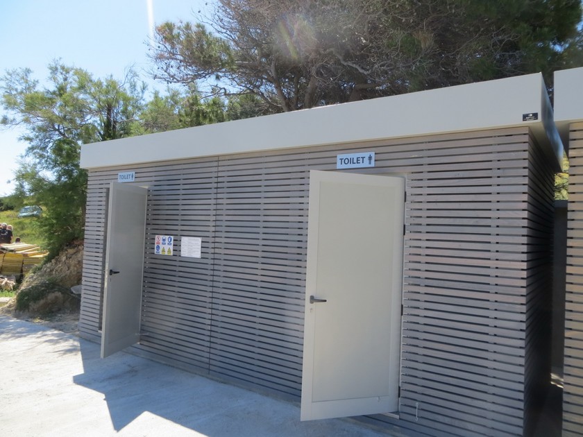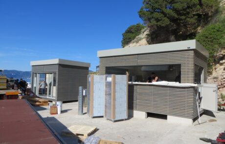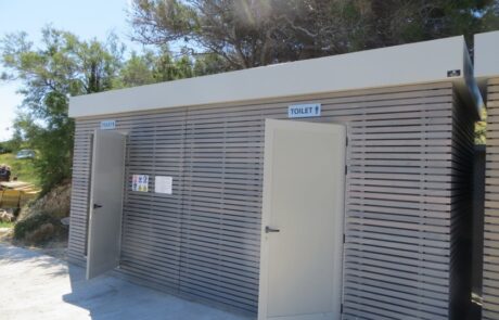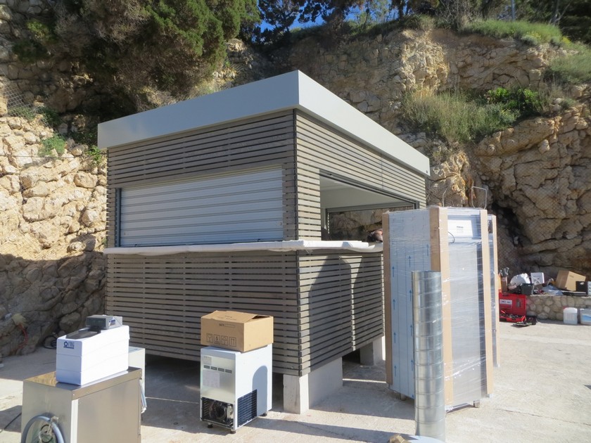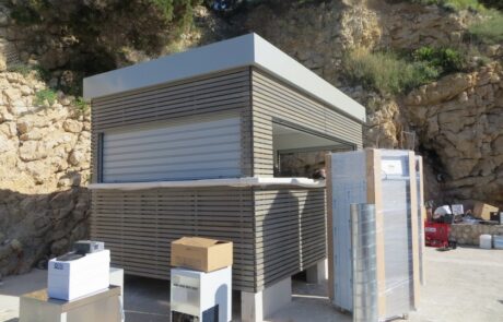 The supplied prefabricated kiosk is oversized with dimensions of 5.0m x 3.0m x 2.47m h (internal height) with the external facade of impregnated wooden slats finaly colored with mineral oil that gives color in naturally oxidized wood in a gray tone, which is applied to the double protection of wooden slats due to exposure to the impact of sea and salt. The walls are thermically insulated PU panels with thickness of 60 mm, the inside of the wall is coated with wall tiles, and concealed electrical and water installations.