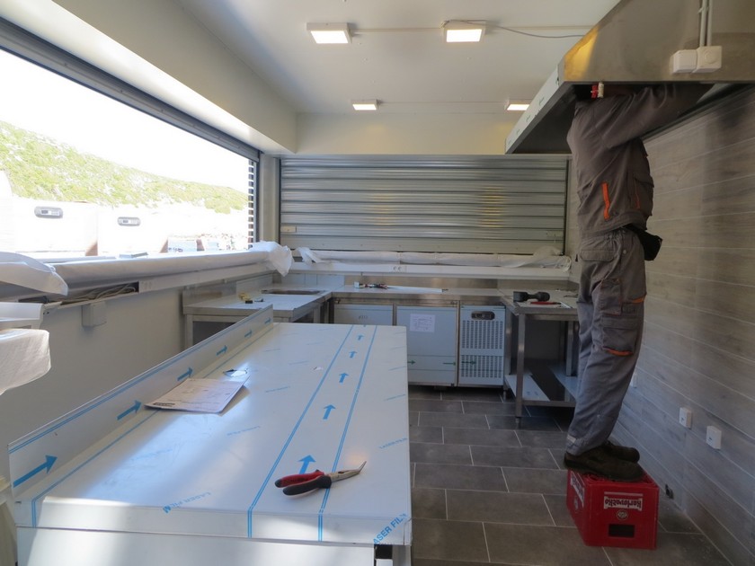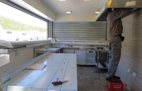 The floor is insulated with PU panel 60mm, because of the weight of catering equipment it’s individually reinforced with the capacity of 500 kg / m², with a built-in double cement particle board, and the final set of rectangular tiles chosen by the customer.